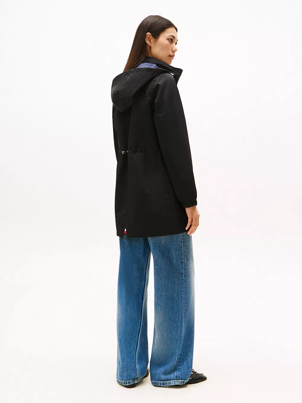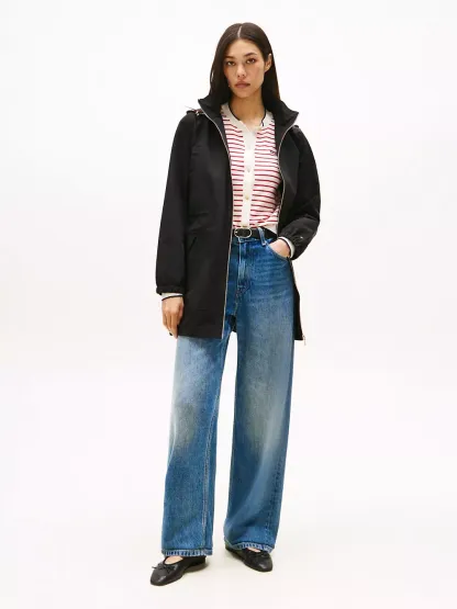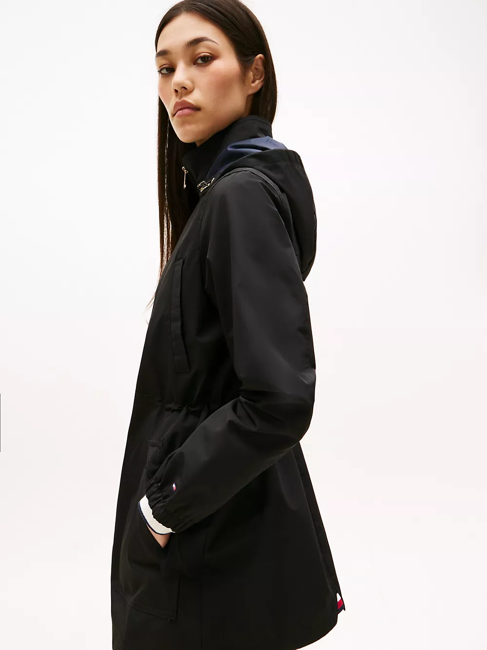 Tommy Hilfiger women's jacket. Our lightweight jacket keeps you covered, thanks to the longline silhouette and bungee drawstring hood. Elastic cuffs and and a channeled bungee waist protect from cool breezes during transitional weather days.