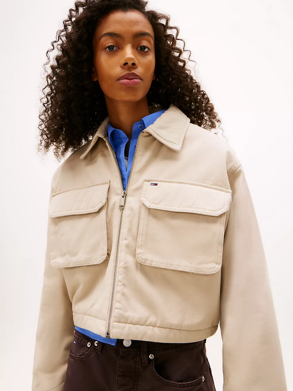 Tommy Hilfiger women's jacket. This workwear-inspired twill jacket is designed with a front zip closure and flap pockets at the chest. This version is made with padded insulation to keep you warm as the temps drop. Part of our Tommy Jeans collection.