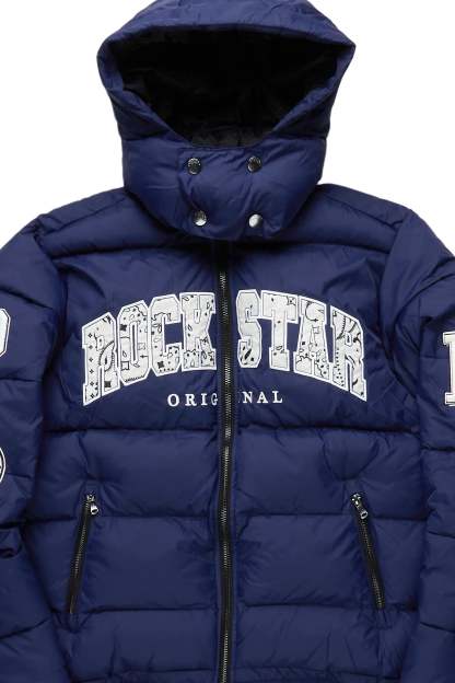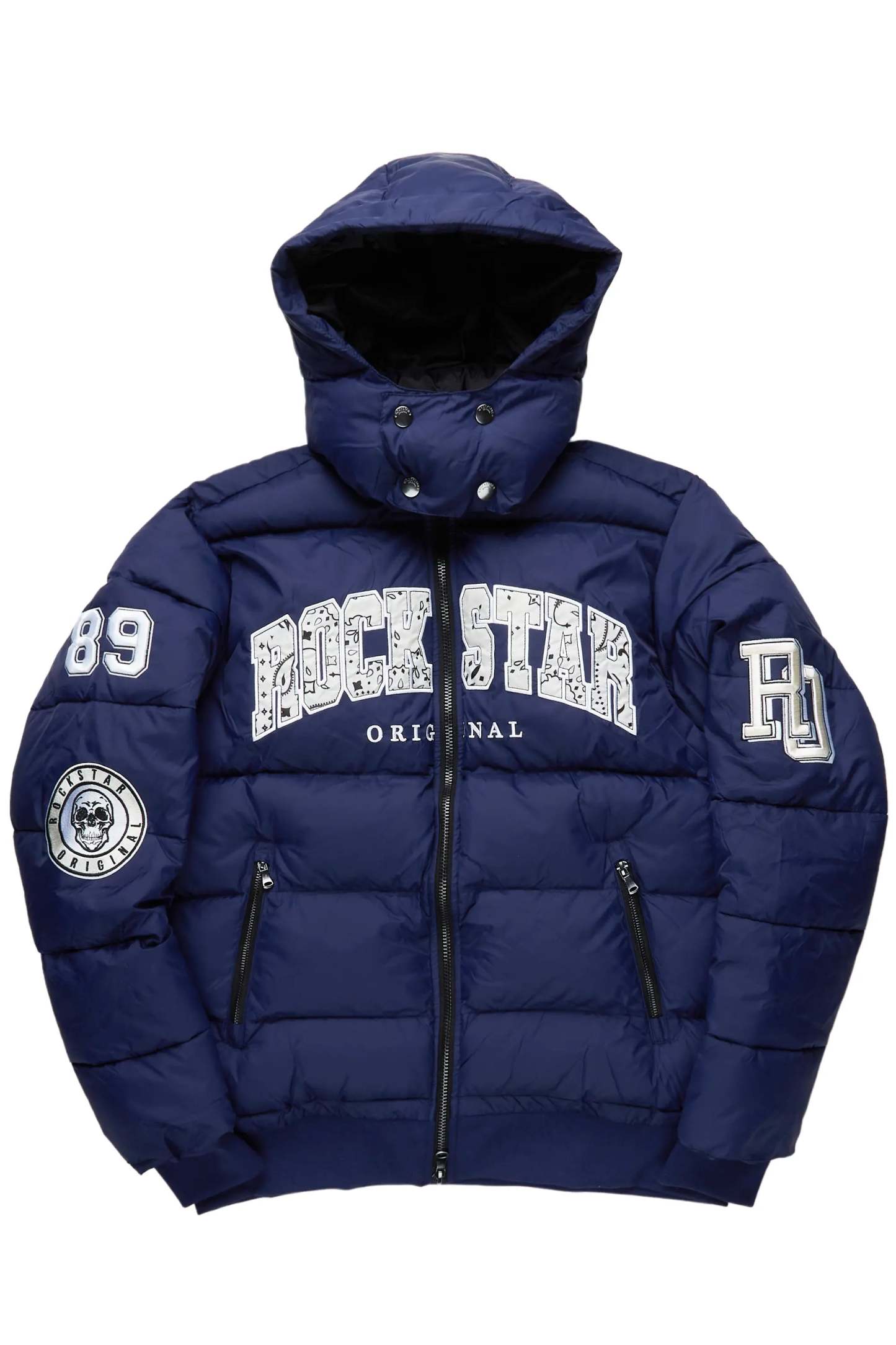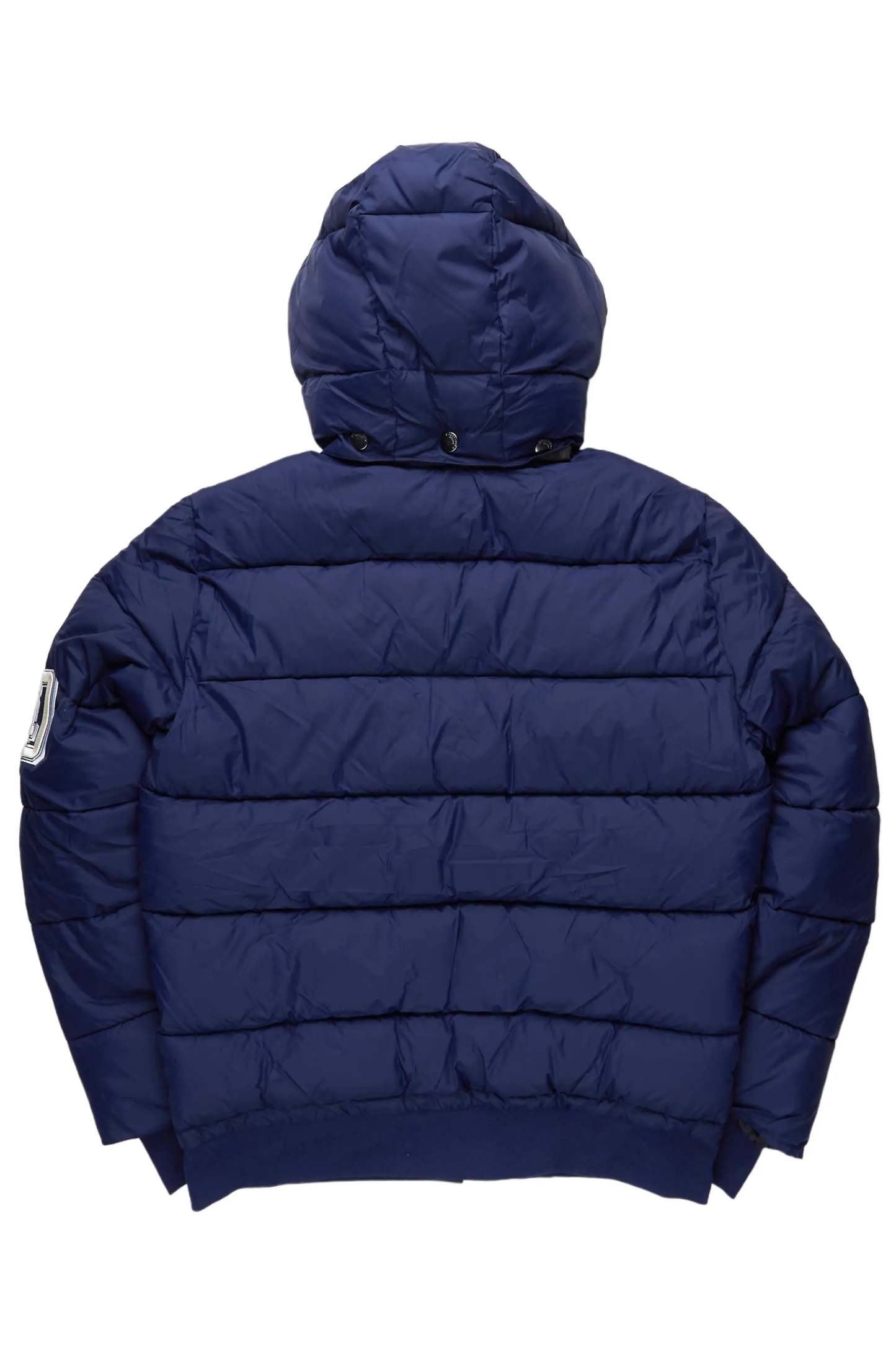 An urban quilted puffer jacket for men in navy. Designed with water-resistant fabric for optimal warmth.