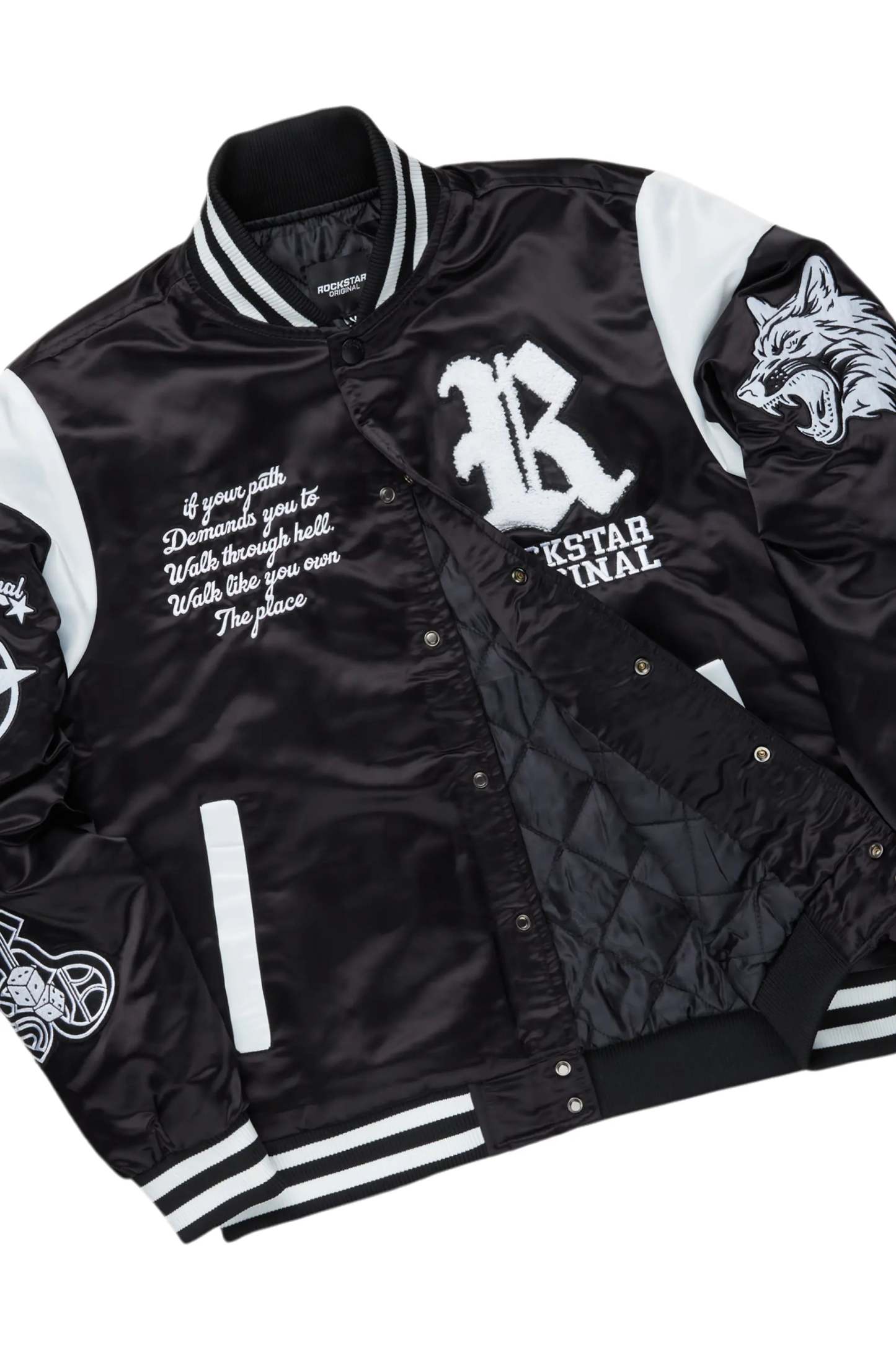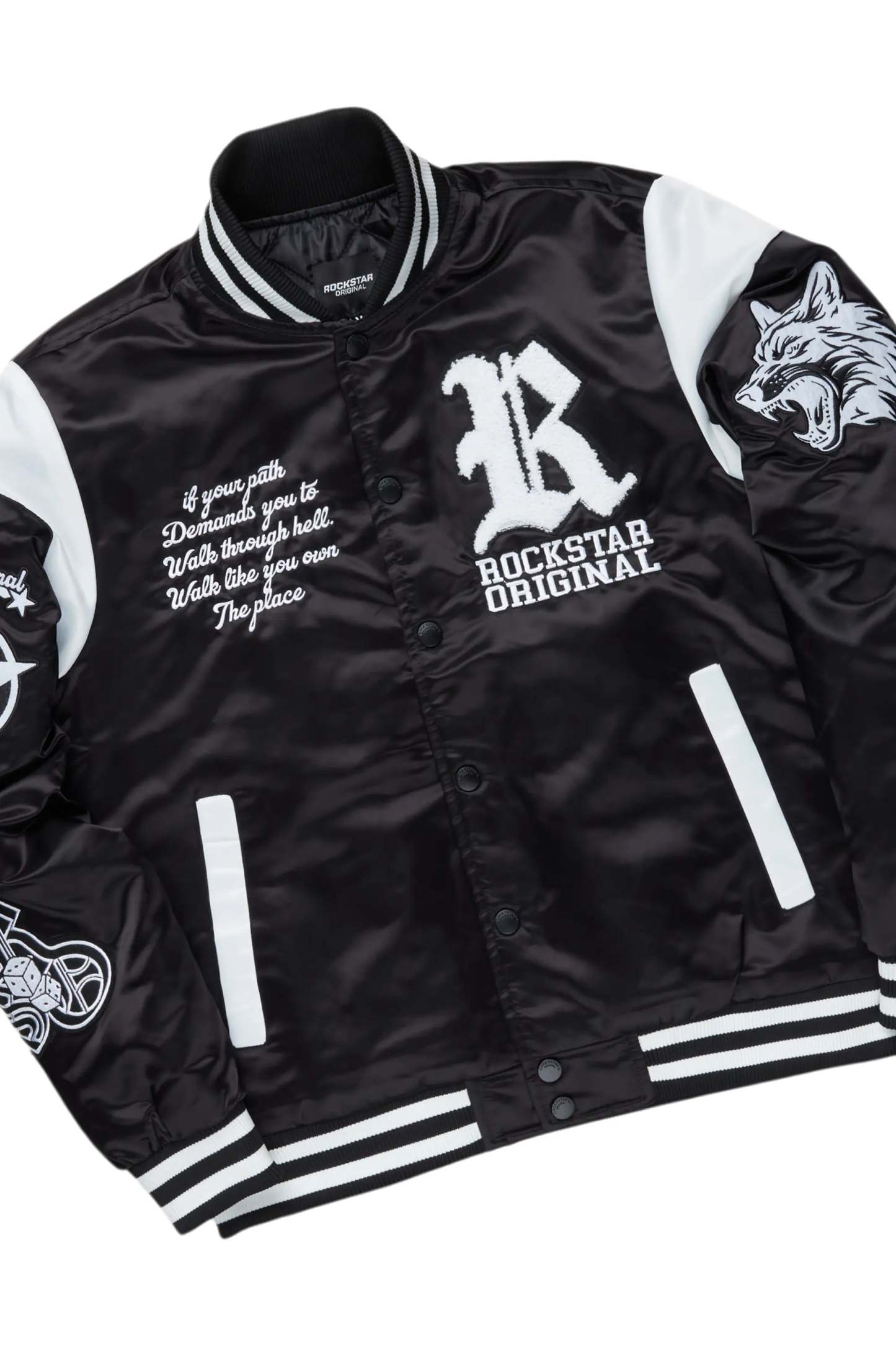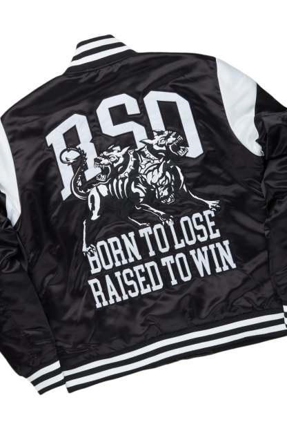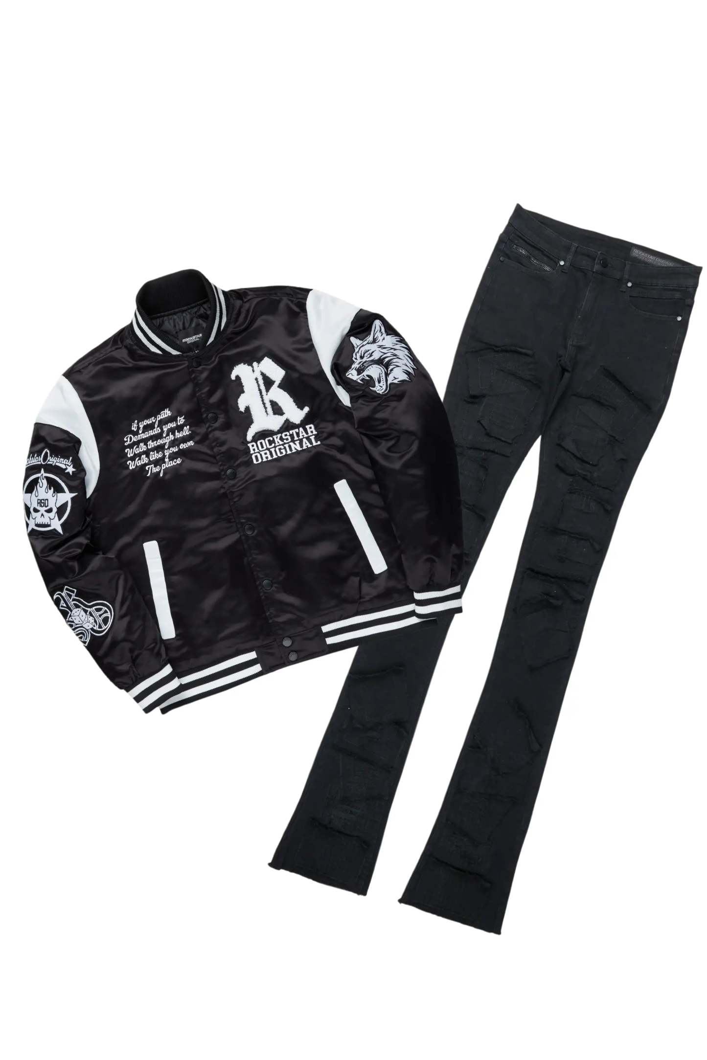 An urban two-piece varsity jacket and super stacked jean set for men. Designed with organic cotton and extra long legs for a dope streetwear outfit set.