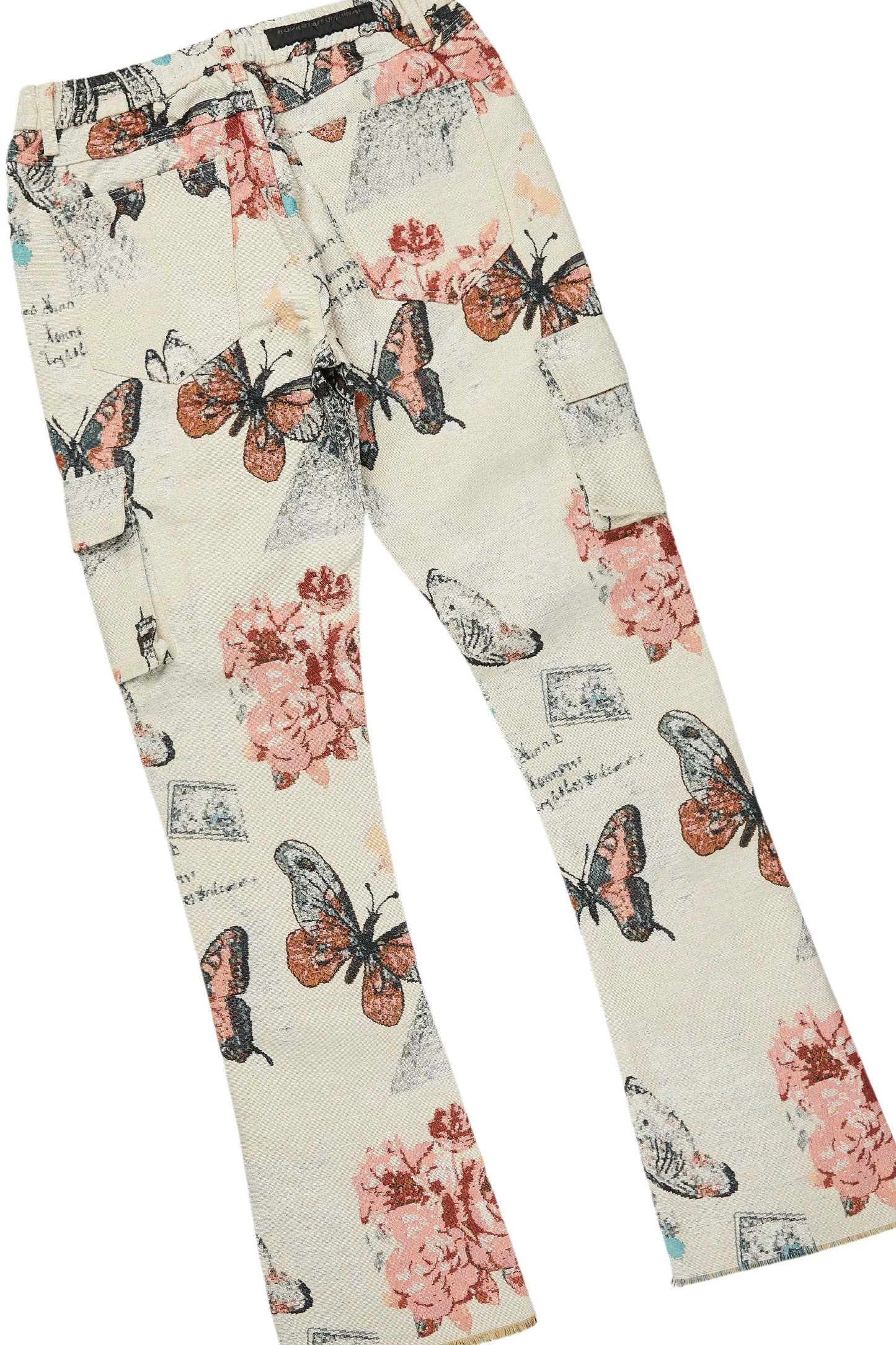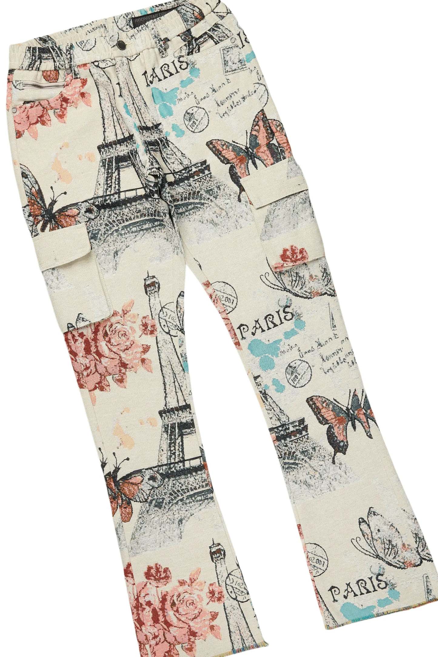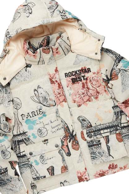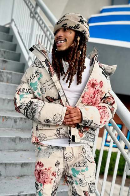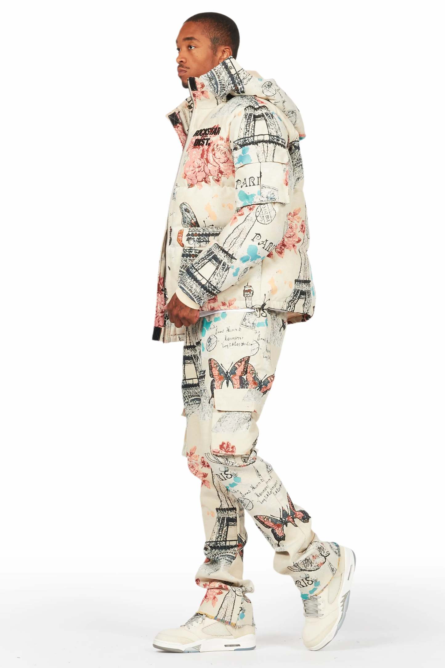 An urban tapestry bubble coat and cargo stacked jean set for men. Designed with premium fabric and custom detailing for a dope streetwear outfit.