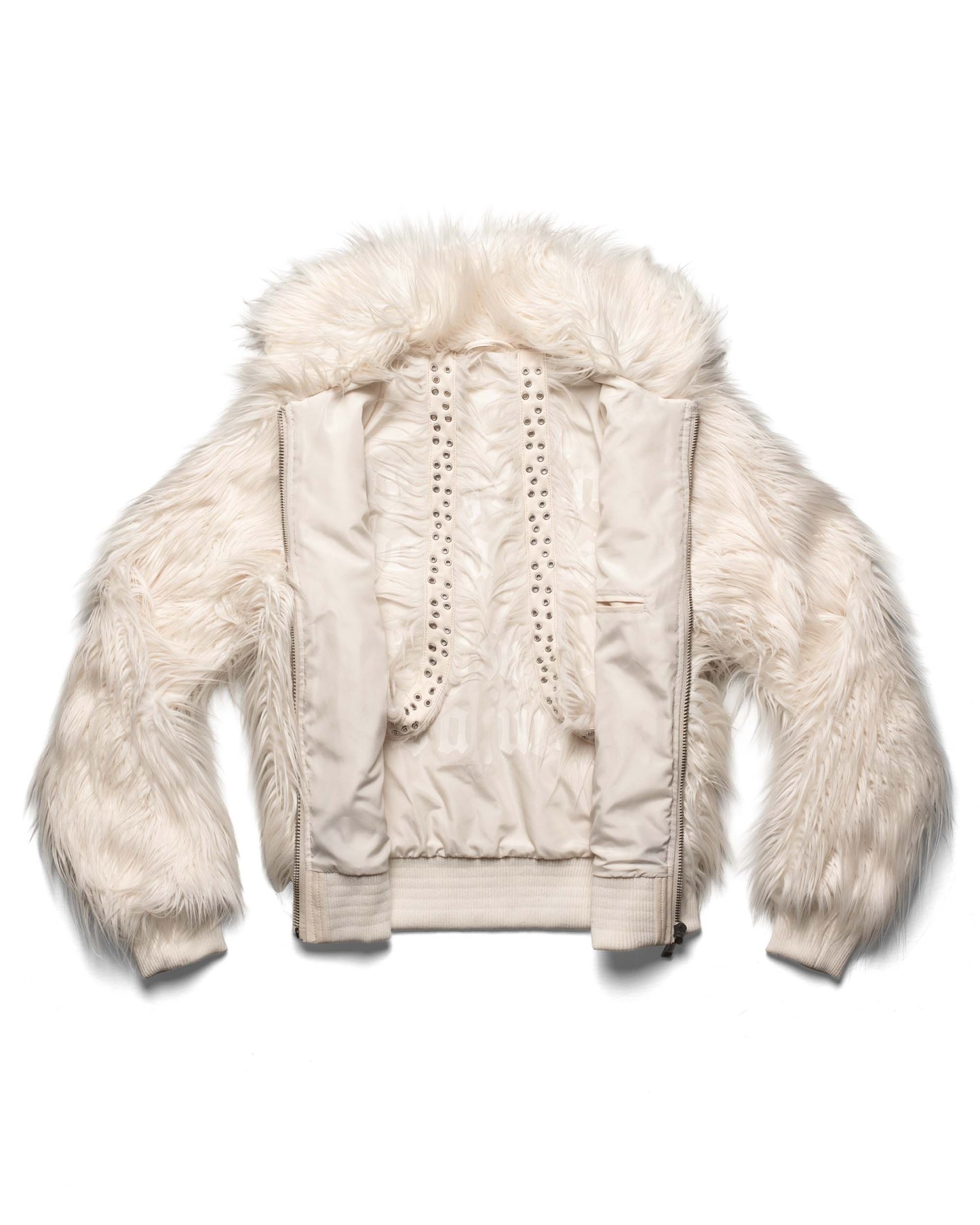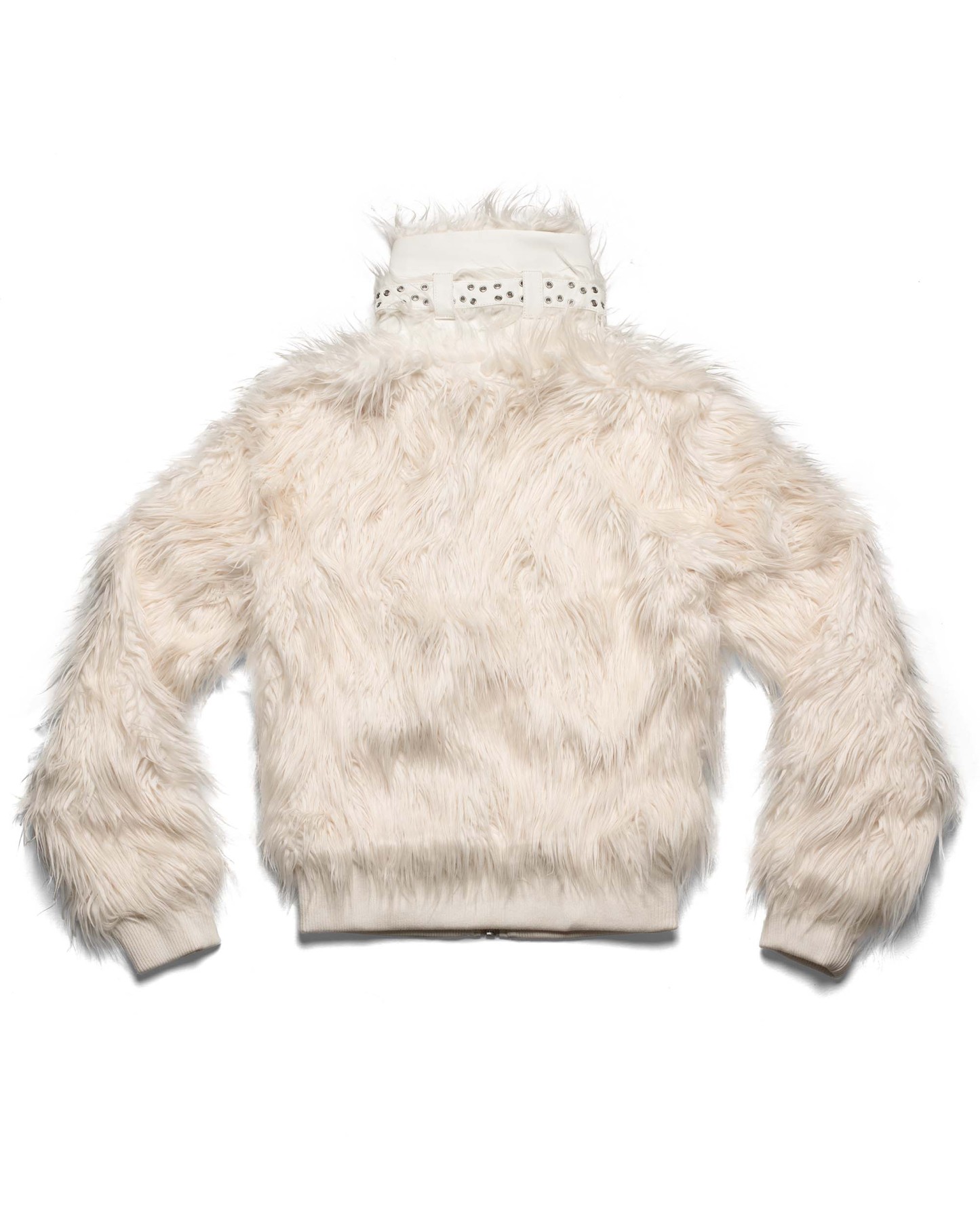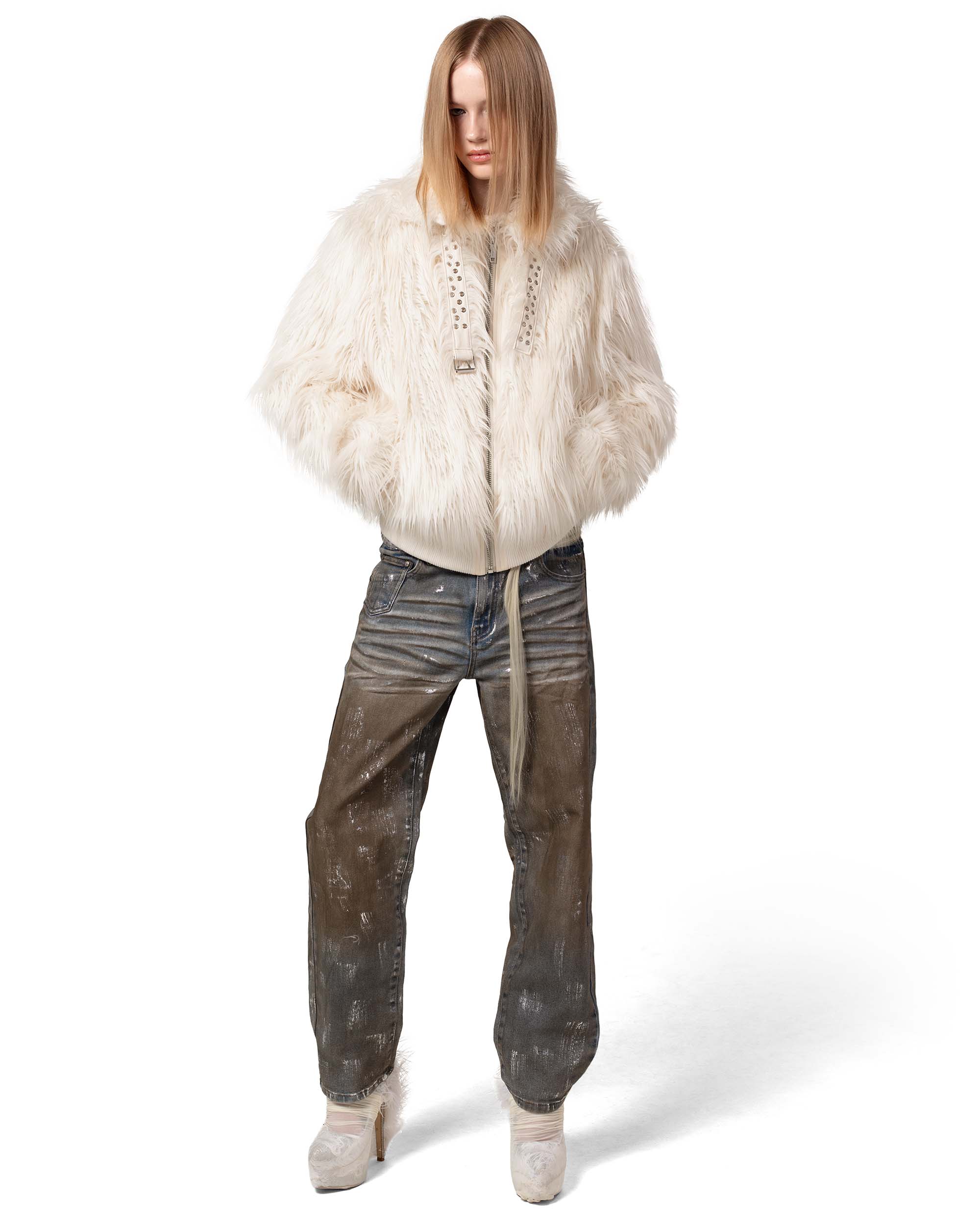 Fall/Winter 25 faux fur bomber jacket in white colorway.